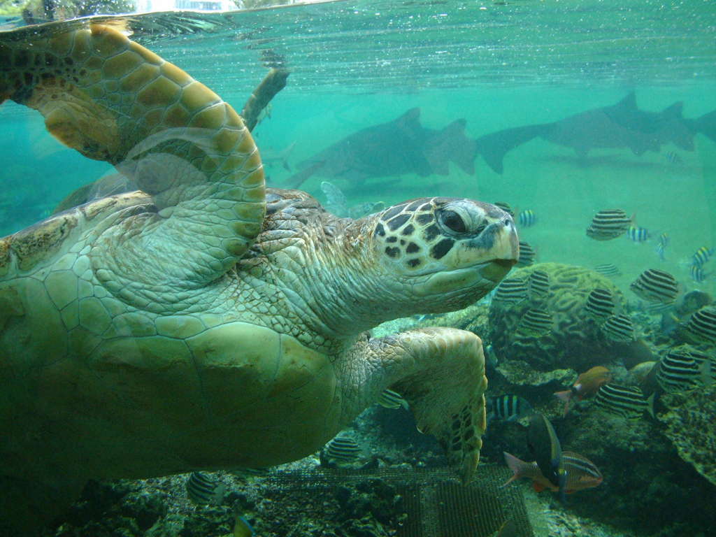 食性はウミガメの中で唯一、植物食傾向の強い雑食で、主に海草(アマモ、ウミヒルモ、リュウキュウ スガモ等)を食べますが、藻類(キクヒオドシ、ツノマタなど)なども食べます。 子ガメは肉食性です。 |