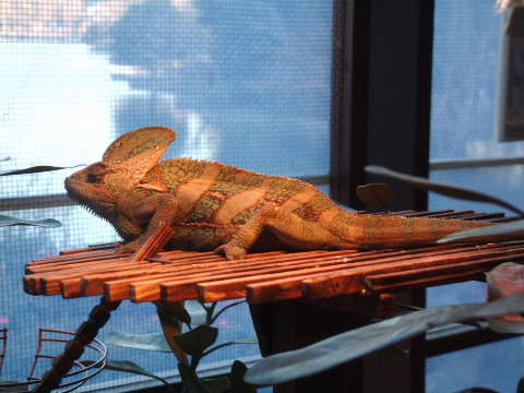 比較的丈夫で、飼育しやすいカメレオンとして有名になった種類です。 高地にある湿度の高い森林に生息します。 危険を感じると体を大きく膨らませて体色を変化させ、口を大きく開けて警戒音を出して威嚇します。 オスの成体は頭部が上方へ高く伸長します。種小名calyptratusは「帽子を被った」の意。 和名は本種の頭部が烏帽子に見えることが由来です。英名のVailedは「ベールを被った」の意です。 幼体やメスの成体は頭部があまり高くなりません。 オスの後肢の踵には突起があります。またメスは妊娠すると体色が黒く変色します。 繁殖形態は卵生で、1回に20〜72個の卵を地中に産みます。 卵は150〜200日程で孵化し、幼体は生後1年で成体と変わらない程の大きさに成長します。 ペットとして日本にも輸入されています。 流通量は多く、主に飼育下繁殖個体が流通します。 カメレオン飼育の入門種と紹介されることもあります。テラリウムで飼育します。 比較的大型(特にオス)になるため、飼育にあたっては大型のケージを用意します。 また樹上棲のため、高さのあるケージで飼育するのが望ましいです。 寿命は5年前後です。 ワシントン条約附属書IIに掲載され、国際取引が制限されています。 |