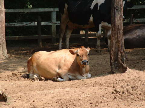 ジャージー(Jersey)は、牛の品種のひとつで、乳牛として飼育されています。 ホルスタイン程ではありませんが、世界中に広く分布しており、バター等乳製品を多量に生産している国 (デンマーク、ニュージーランド等)では最重要品種です。 ヨーロッパでは多くの品種が生み出されてきました。ジャージーは乳の量が少ないかわりに脂肪が多く、 バターなどの乳製品を作るのに最適です。 イギリス領海峡諸島のジャージー島原産で、在来のブルトンとノルマンとの交雑に発しますが、 過去600年程純粋に保たれているといわれ、斉一性が高いことで知られます。 毛色は、明るい淡褐色から暗い黒褐色まで様々ですが、単色で体の下部や四肢の内側は色が淡く、 頭、頸(くび)、尻(しり)に濃色のボカシのあるものがほとんどです。 体はホルスタインに比べて小型で、細くてきゃしゃな骨格をしており、顔はしゃくれていて目が大きいので、 鹿のような可憐な印象を与えます。性質は活発ですが、やや神経質です。 体が小さいため、乳量は年間約3,500kg程とそれほど多くありません。 日本では1874年(明治7年)にアメリカから輸入され、国内では群馬県において小規模に飼育される程度で あまり増えませんでしたが、専業搾乳業者が飲用乳の乳脂率を調整するために少数飼育されていました。 その後25,000頭程までに増えましたが、牛乳メーカーが歓迎せず、また、飲用乳地帯の拡大に伴い、 乳量が多いホルスタイン種に押されて激減し、現在の国内飼養頭数は8,000〜10,000頭余りであると 推測されます。 |