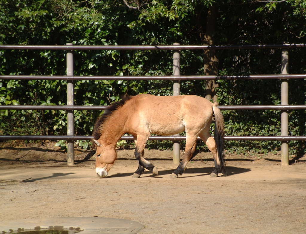 モウコノウマは、シマウマ、ノロバを除いた唯一の現存する野生馬です。 かつてアジア中央部、特にモンゴル周辺(アルタイ山脈周辺)に多数棲息していましたが、 野生下では一度絶滅し、飼育個体の子孫を野生に戻す試みが各地で続けられています。 かつての原産地モンゴルでは「魂」を意味する、タヒ、またはタキと呼ばれています。 年長のメスに率いられた小規模の群れで暮らします。群れの構成はリーダーのメスを中心に数頭の メスとその子供からなり、群れの周辺には1頭前後のオス個体がいます。 草原の草を食べる典型的なグレイザーです。 毛色はいわゆる薄墨毛で、全体的に淡い褐色です。四肢と鬣(たてがみ)、尾は濃い褐色になります。 冬になると毛の色合いが薄くなり、かつ毛が長くなります。鬣は常に直立しており、家畜馬のように 倒れません。口先に白いポイントがあります。 1879年、ロシアの探検家プルツェワルスキーによってモンゴルで発見され、広く知られるようになりました (学名及び英名は発見者に対する献名)。 しかし1966年にハンガリーの昆虫学者によって目撃されたのを 最後に野生下での目撃情報が確認されなくなり、恐らく1968年頃に野生下では一度絶滅したと見られて います。しかし発見以後多くの個体が欧米諸国の動物園に送られており、その子孫が生き残っていた 事から、飼育下での計画的な繁殖が始められ、再野生化が試みられました。 現在は、世界各地の動物園で1000頭以上が飼育されています。モンゴルのフスタイ=ヌルー保護区で 再野生化が行われ百頭以上に回復しています。また、新疆ウイグル自治区の自然保護区等で、 再野生化の目的で飼育個体の一部の導入が行われています。 寿命は飼育下で約20年です。 |