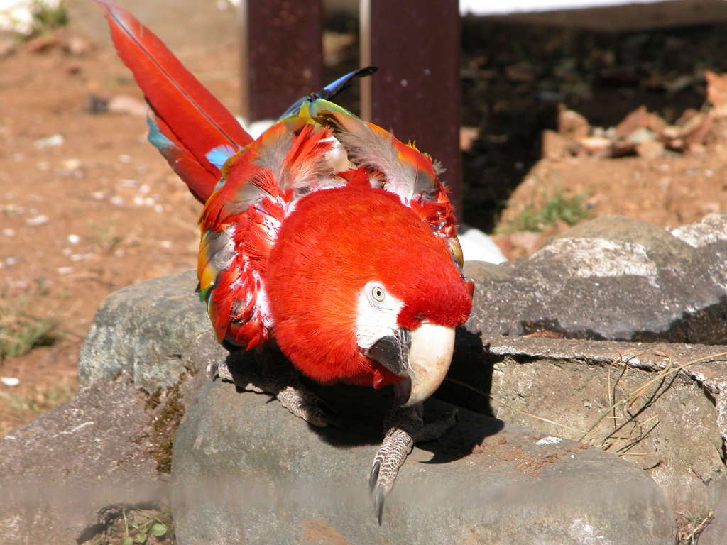 アカコンゴウインコは亜熱帯雨林の湿潤な低地、開けた森林帯、川辺そして中央アメリカおよび南アメリカ のサバンナに生息しています。 コンゴウインコの代表種で、単にコンゴウインコとも呼ばれます。 羽毛色は緋色で、翼の中央は鮮黄色、その先は鮮青色で目立ちます。顔の裸皮部分は白く広く、尾は朱色 で長い楔状をしています。クチバシは薄黄色で、アゴは黒っぽいです。ベニコンゴウインコと似ていますが、 ベニコンゴウインコの顔には赤い筋があります。 枝から枝へ移動する際には,クチバシを「第3の足」として利用します。 コンゴウインコ類は土を食べます。これはミネラルを摂るためと言われています。 コンゴウインコはポピュラーではありますが、手間のかかるペットです。購入するにも、もらい受けるにも、 また世話をするのも費用がかさみ、要求が多く、そして何よりも声が大きく、やかましい鳥です。 しかし、飼い主には非常によく懐きます。人の話し言葉を上手に使う能力を持った、知的な種です。 ペット売買のための捕獲と居住地の破壊により絶滅に追いやられています。 ホンジュラスの国鳥です。 ワシントン条約附属書Tに記載され、取引は厳しく制限されています。 |