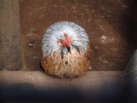 | 主な特徴 | 江戸時代に軍鶏(シャモ)と小国(ショウコク)から作り出されました。 小型のニワトリを矮鶏(チャボ)と呼ぶ慣習があったため名前に「チャボ」と付いていますが、 「チャボ」とは別の品種です。 尾羽や蓑羽が長く、時には1mに達する場合もあります。 地面に付くほど伸びる蓑羽(みのげ)が伸びていることから、「ミノヒキ」または「オヒキ」になった と言われています。 品種には赤笹種、白藤種等あります。写真は白藤種です。 昭和12年、国の天然記念物に指定されました。 |