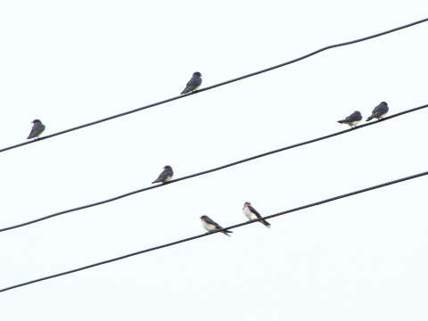 山間の村落、町、市街に多く、営巣地付近のあらゆる環境を飛翔して採餌地とします。 農薬使用の影響で農村地帯で数が減少しましたが、次第に回復しています。 飛行速度は普段は時速50kmくらいですが、最高で200kmくらい出せ、ホバーリングもできます。 チュビクチュツリリリリリと鳴きます。 背は光沢のある藍黒色で、喉と額が赤く、腹は白く、胸に黒い横帯があります。尾は長く切れ込みの深い 二股形で、この尾の形をツバメにちなんで燕尾形といいます。翼が大きく、飛行に適した細長い体型です。 脚は短く歩行には不向きで、巣材の泥を求めるとき以外は地面に降りることはめったにありません。 繁殖期には巣を中心とした狭い縄張りを持ち、ヒナは独立すると、夕方から河川の流域や海岸や河口の ヨシ原、耕地に集合して塒(ねぐら)を形成します。晩夏から秋には数万羽という大群になり、電線に並んで 止まることがあります。こうした集団塒(ねぐら)を形成する個体には若鳥が多いようです。 泥と枯草を唾液で固め、椀形(わんがた)の巣を造ります。ほとんど人工物に造巣し、民家の軒先など人が 住む環境と同じ場所で繁殖する傾向が顕著です。これは、天敵であるカラスなどが近寄りにくいからだと 考えられています。 普通は1つの建物に1個の巣がありますが、沢山ある場所もあります。産座には枯れ草や羽毛を敷きます。 古巣を利用することが多いです。造巣はオスメスで行いますが、内装はメスが整えます。卵数は3〜7個で 1日1卵ずつ産卵します。 オスメスで抱卵、育雛を行います。約13日で孵化(ふか)し、約20日で巣立ちます。作業の分担はメスの ほうがオスより圧倒的多いです。 落ちているツバメのヒナを拾って人間が育てることはとても困難で、野鳥なので日本での飼育は鳥獣保護法 によって禁じられていますが、保護のために許可を得て飼育することは可能です。 日本の以下の都道府県で、レッドリストの指定を受けています。 ・準絶滅危惧(NT) - 千葉県 ・その他 - 神奈川県、鹿児島県 |