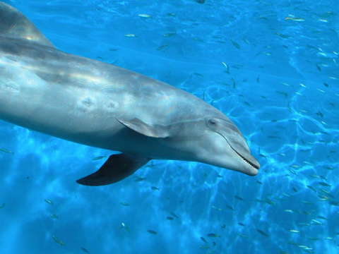 水族館などではもっともポピュラーなイルカで、人によく馴れます。 イルカと呼ばれる仲間では大型の種類に属します。 体色は濃いグレーで腹部がやや白いですが、生息する地域により差があります。 群れで暮らし、協力し合って狩りや子育てを行います。そのため仲間どうしのコミュニケーションが活発 に行われ、「ピーピー」、「ニャア」といったような音を出して、仲間同士で連絡をとりあいます。 これをエコーロケーションといいます。エコーロケーションとは1000〜20万Hzの断続音(人の耳にはカチッ、 カチッと聞こえるクリック音)をメロン(頭部にある音を集めて発射する器官)から発射します。そして反射 してきた音は、下あごの骨を通って耳に達します。このように超音波で物を見ることをエコーロケーション といい、エサを探したり仲間とコミュニケーションをとったりするのに使われます。 そのほか、接触によるコミュニケーションも行われるようです。 本来の和名は「ハンドウイルカ(半道海豚)」というのが正式なのですが、1957年、鯨類学者の西脇昌治 博士が「バンドウイルカ(坂東海豚)」と提唱したのが発端となり、現在では「バンドウイルカ」という呼び名 が一般化しています。 寿命は約40年ほどと言われています。 |
