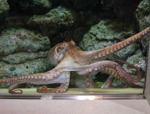 沿岸〜大陸棚の水深200mほどの海底に生息していますが、浅い海岸付近で見るこ ともあります。 タコの仲間では最大で、寒い海を好みます。 体が大きくて皮膚がゆるく、体は柔らかいです。 外套膜(がいとうまく:頭に見える部分)には、縦にシワが走っています。 大きさに似合って力が強く、襲われたら人間でも危ないですが、めったに人を襲うこと はありません。 オスとメスの見分け方は、吸盤が整然と並んでいるのがメスで、雑に並んでいるのが オスです。また、オスのほうが吸盤は大きいです。 寿命は3〜4年と言われています。 |