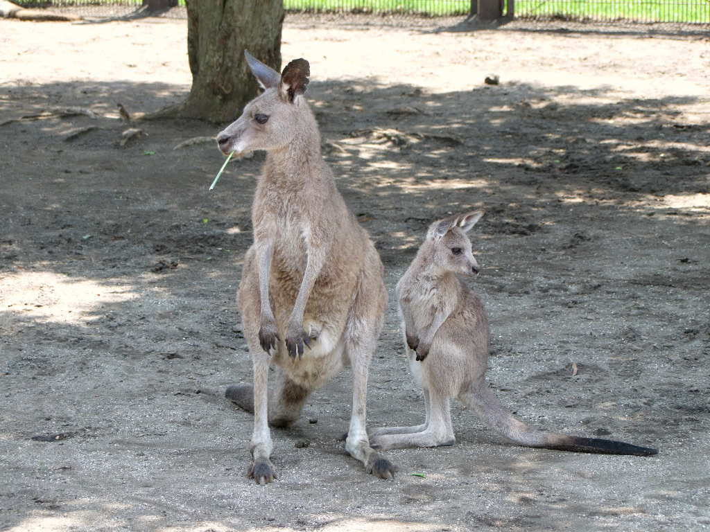 草原や半砂漠地帯、荒地、森林に生息します。 薄明薄暮性で、昼間は木陰などで休みます。跳躍力は強く、2.5mくらいの高さのものは飛び越え、 時速55kmくらいで走ることができます。 10〜20頭の小規模な群れを形成し生活しますが、最大で約100頭の群れを形成することもあります。 オス同士では尾でバランスを取り、前肢で引っ掻いたり後肢で蹴りを繰り出すボクシングのような 闘争を行います。 カンガルー属内でも大型で、種小名giganteusは「巨大な」の意で和名とほぼ同義です。 全身は灰色の柔らかい体毛で被われ、尾の先端は黒い体毛で被われます。 妊娠期間は約30〜40日で、生まれてきた子供は体重約1g、体長約2cmと小さく、育児嚢の中で約44週間 過ごします。袋から出てからも半年間は、袋の中に頭を突っ込み、母乳を飲みます。 オーストラリアでは食用とされることもあるほか、肉は海外にも輸出されています。 生息地および生息数が増加傾向にあります。これにより家畜との競合が問題になり、駆除されることも あります。夜に車のライトに向かってくることがあり、交通事故により命を落とすこともあります。 大型動物のため車が負う被害も大きいことから、交通事故の際に車体を保護するバンパーもあります。 寿命は野生で8〜10年です。 |