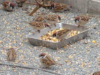 日本では最も普通の鳥です。 すずめは水浴びも砂浴びもする珍しい鳥です。 人家の軒下や、竹林などに集団でねぐらを作ります。 臆病なので人間を恐がりますが、人間が住んでいる所にしかいません。 |
