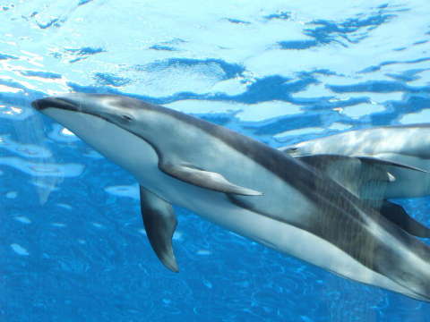 群れで行動することが多く、時には数百頭から数千頭もの大きな群れが確認されたこともあります。 セミイルカやハナゴンドウなど、他の小型鯨類と一緒に行動することもあります。 日本の水族館ではバンドウイルカに次いで多く飼育されています。 背びれの形が「鎌(かま)」に似ているのが名前の由来です。 体色は背中が黒から黒灰色、、お腹は白っぽく、流れるような美しい流線型をしています。 泳ぐ速度は時速50kmを超えます。 好奇心旺盛で、船の近くにも寄って来ます。 群れで暮らし、協力し合って狩りや子育てを行います。そのため仲間どうしのコミュニケーションが活発 に行われ、「ピーピー」、「ニャア」といったような音を出して、仲間同士で連絡を取り合います。 これをエコーロケーションといいます。エコーロケーションとは1000〜20万Hzの断続音(人の耳にはカチッ、 カチッと聞こえるクリック音)をメロン(頭部にある音を集めて発射する器官)から発射します。そして反射 してきた音は、下あごの骨を通って耳に達します。このように超音波で物を見ることをエコーロケーション といい、エサを探したり仲間とコミュニケーションをとったりするのに使われます。 そのほか、接触によるコミュニケーションも行われるようです。 寿命は40年前後ほどと言われています。 |